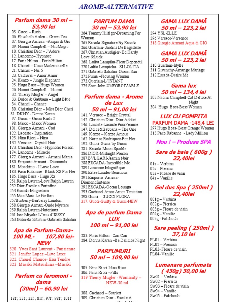 Am dori si lista denumirea parfumurilor si noile coduri de dama de la 301 la 358 si cele de. Panouri publicitare pentru parfumuri. Un singur pret pentru peste 300 de parfumuri. Flacon 50 ml de parfum pentru barbati.